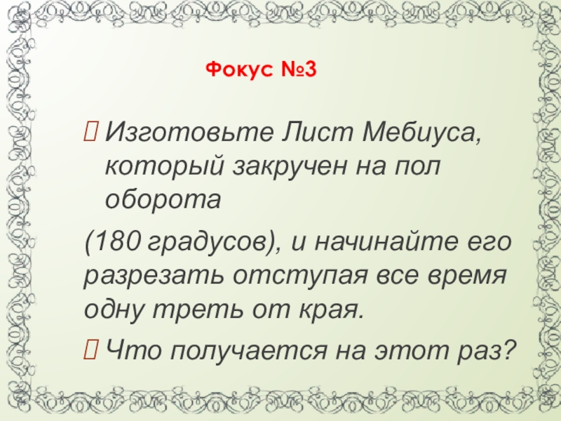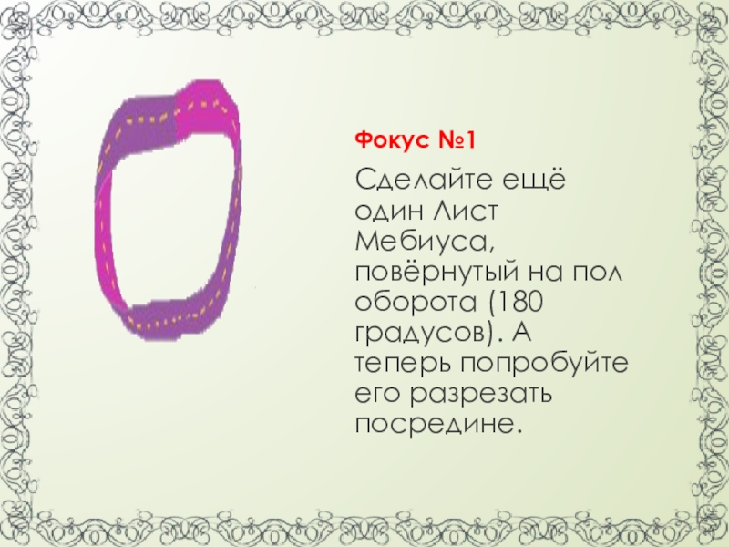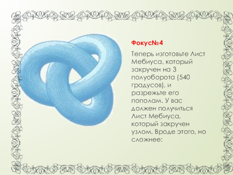 и разрежьте его пополам. У вас должен получиться Лист Мебиуса, который закручен узлом. Вроде этого, но сложнее: