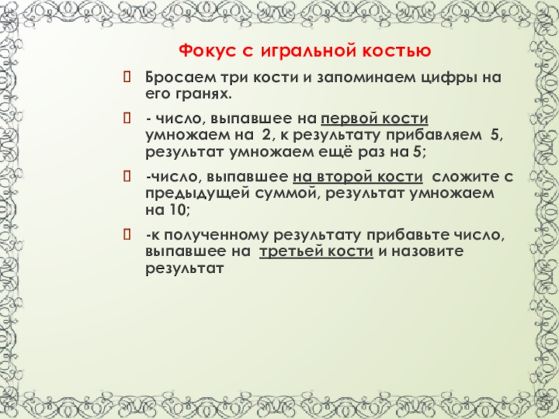 Слайд 28 Фокус с игральной костью