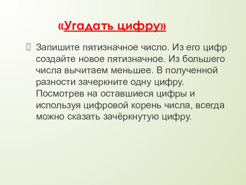 Из большего числа вычитаем меньшее. В полученной разности зачеркните одну цифру. Посмотрев на оставшиеся цифры и используя цифровой корень числа, всегда можно сказать зачёркнутую цифру.