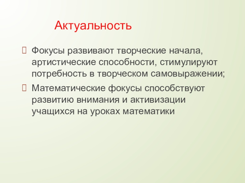 Фокусы развивают творческие начала, артистические способности, стимулируют потребность в творческом самовыражении;