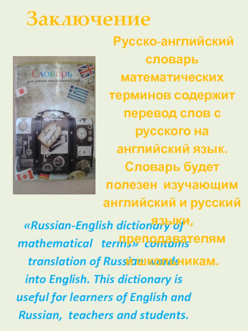 Русско-английский словарь математических терминов содержит перевод слов с русского на английский язык. Словарь будет полезен изучающим английский и русский языки, преподавателям