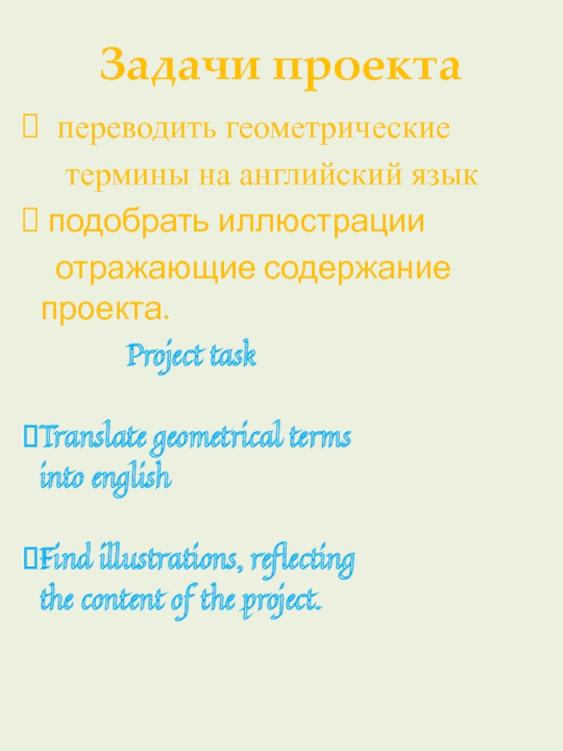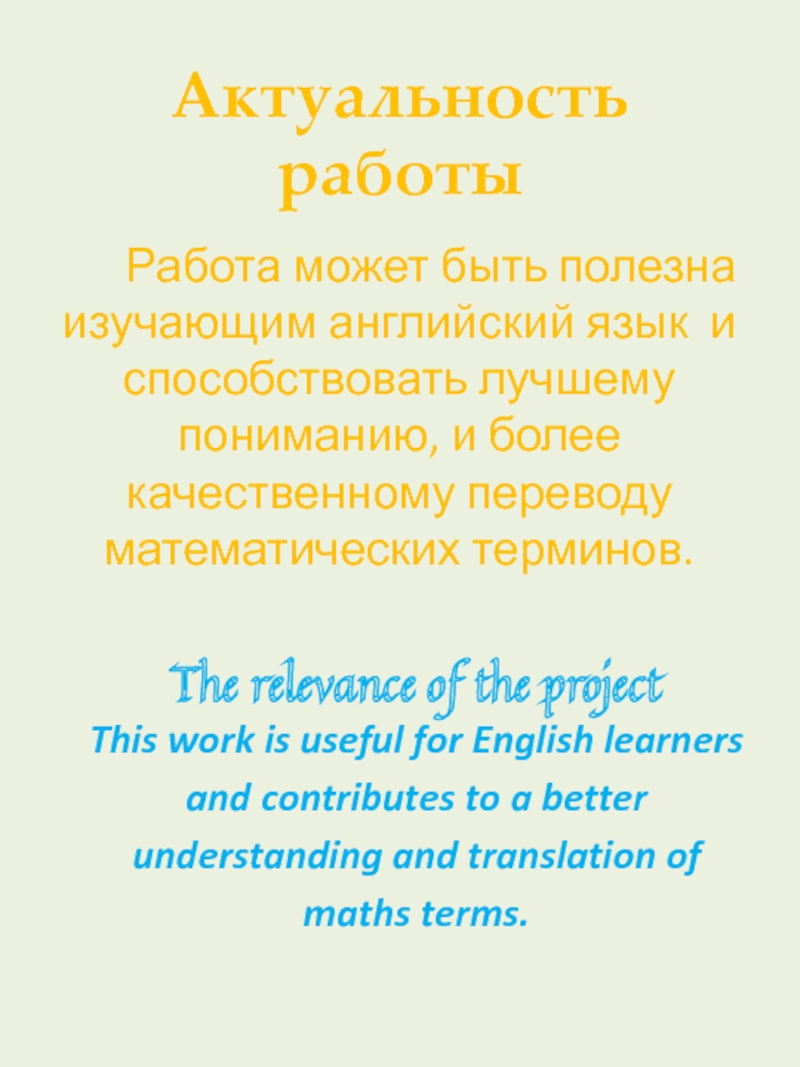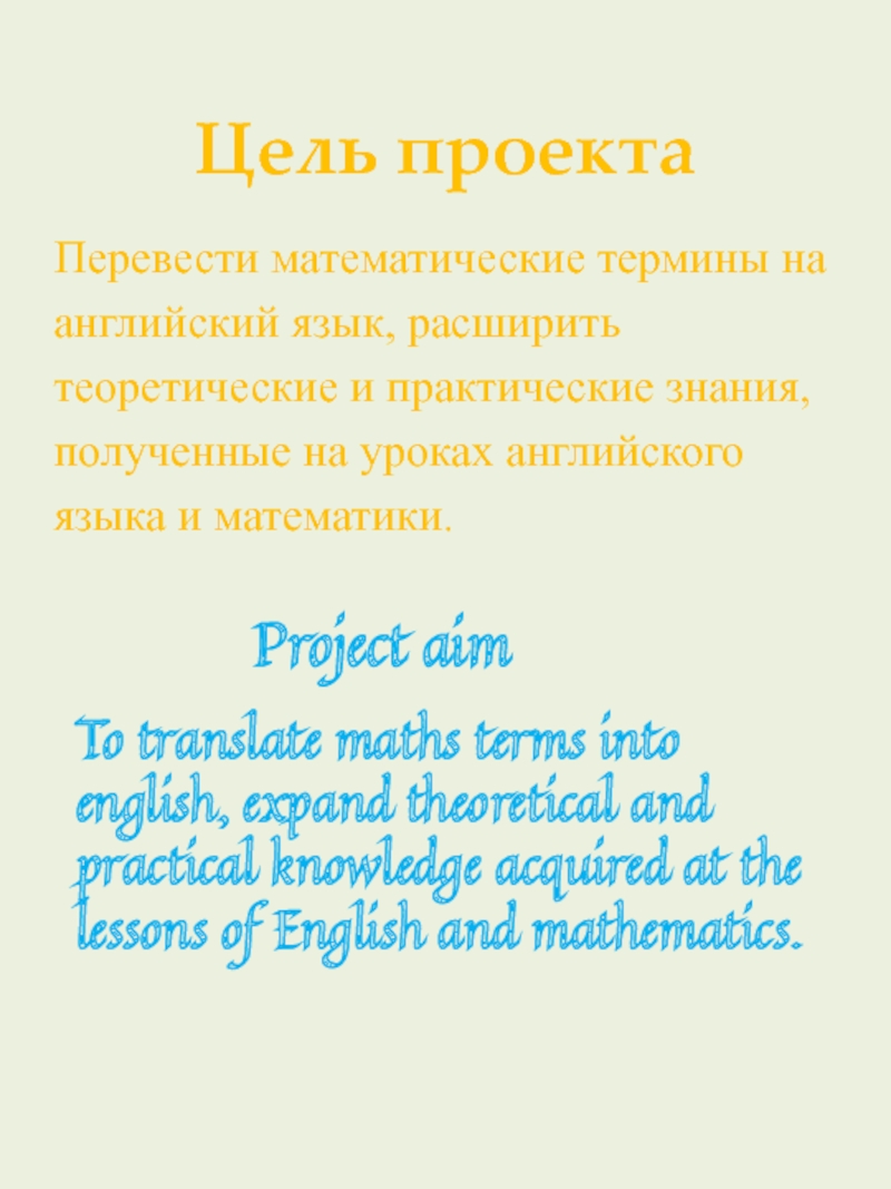 To translate maths terms into english, expand theoretical and practical knowledge acquired at the lessons of English and mathematics.