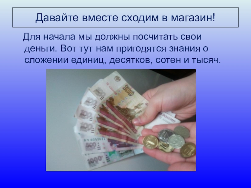 Давайте вместе сходим в магазин!  Для начала мы должны посчитать свои деньги. Вот тут нам пригодятся