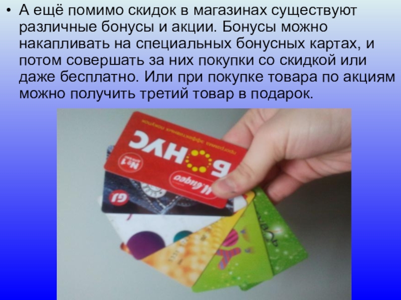 А ещё помимо скидок в магазинах существуют различные бонусы и акции. Бонусы можно накапливать на специальных бонусных