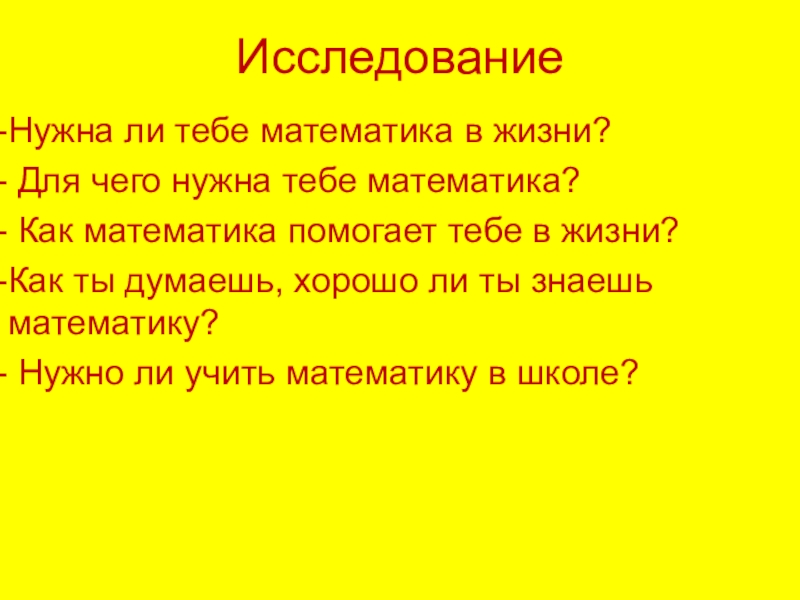 ИсследованиеНужна ли тебе математика в жизни? Для чего нужна тебе математика? Как математика помогает тебе в жизни?Как