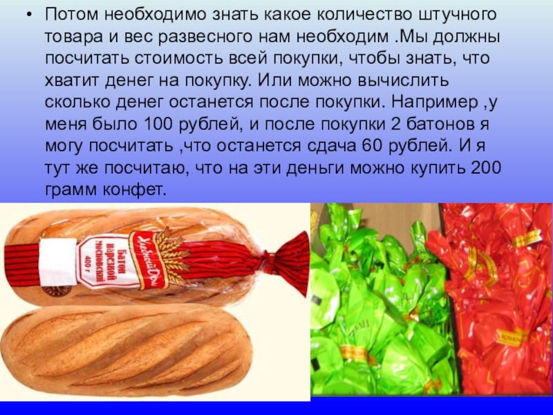 Потом необходимо знать какое количество штучного товара и вес развесного нам необходим .Мы должны посчитать стоимость всей