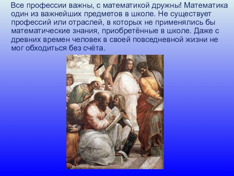 Все профессии важны, с математикой дружны! Математика один из важнейших предметов в школе. Не существует профессий или отраслей, в которых не применялись бы математические знания, приобретённые в школе. Даже с древних времен человек в
