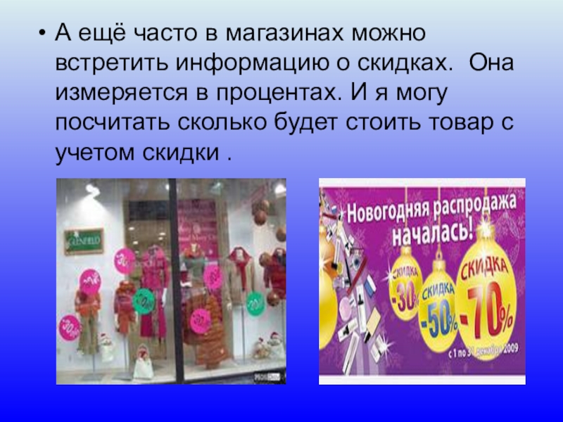 А ещё часто в магазинах можно встретить информацию о скидках. Она измеряется в процентах. И я могу