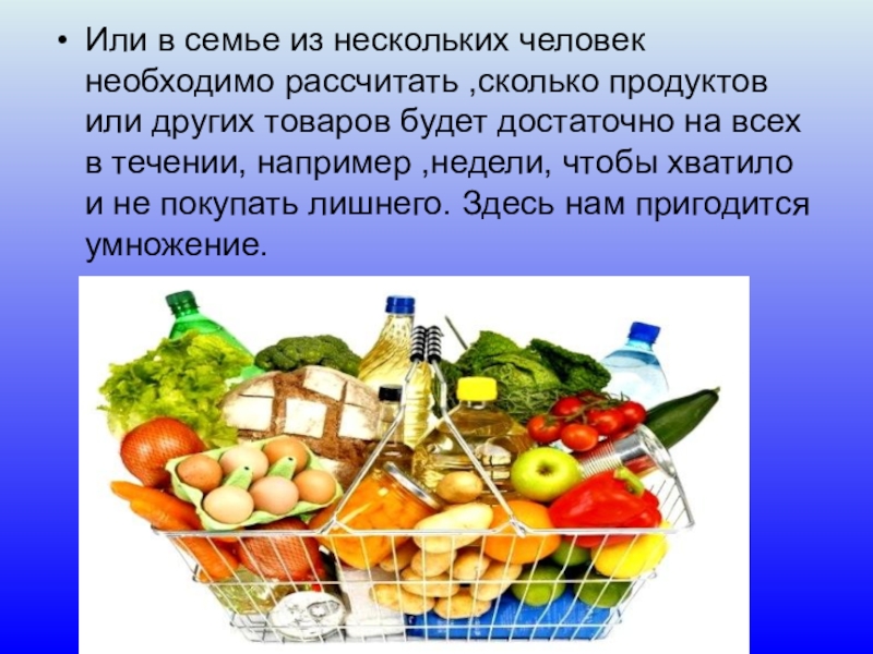 других товаров будет достаточно на всех в течении, например ,недели, чтобы хватило и не покупать лишнего. Здесь нам пригодится умножение.