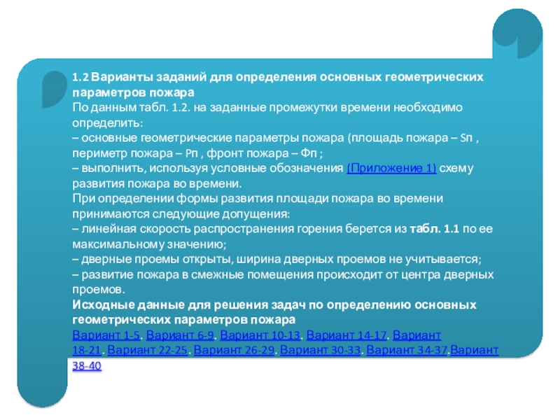 1.2 Варианты заданий для определения основных геометрических параметров пожара