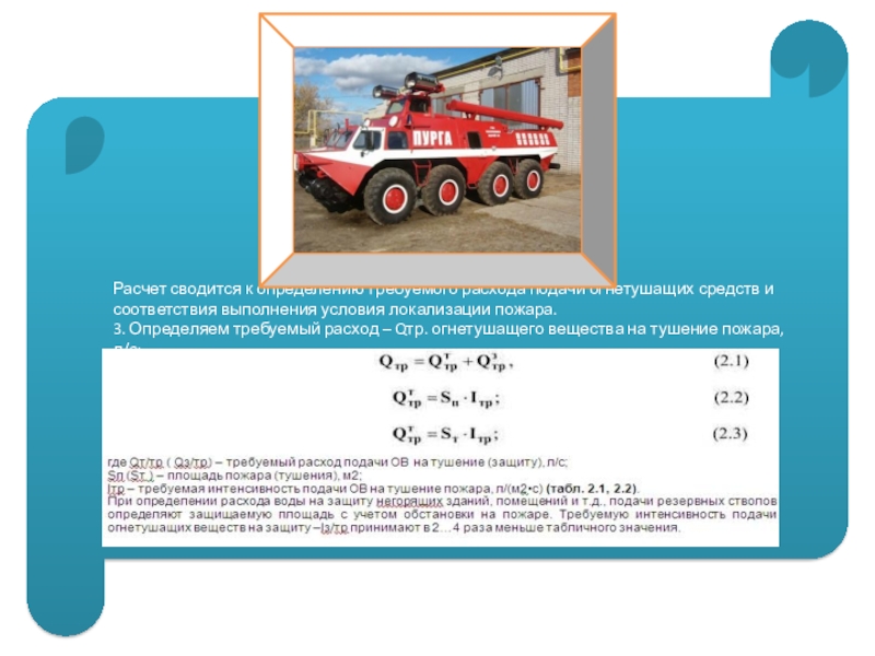 Слайд 21Расчет сводится к определению требуемого расхода подачи огнетушащих средств и соответствия