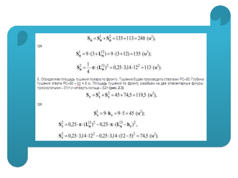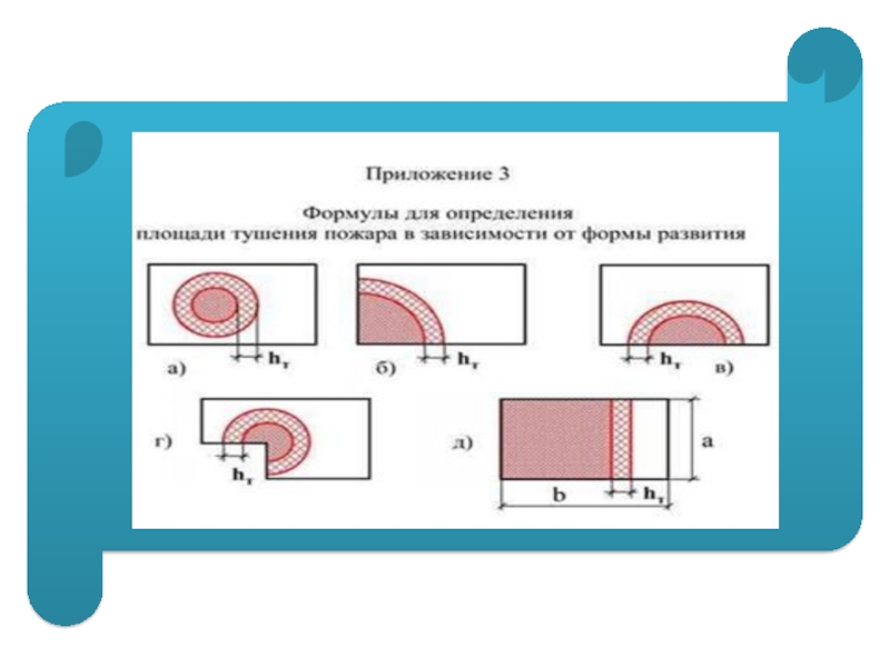 Площадь тушения определяется аналитическим методом в зависимости от формы площади пожара по известным математическим формулам (Приложение 3).