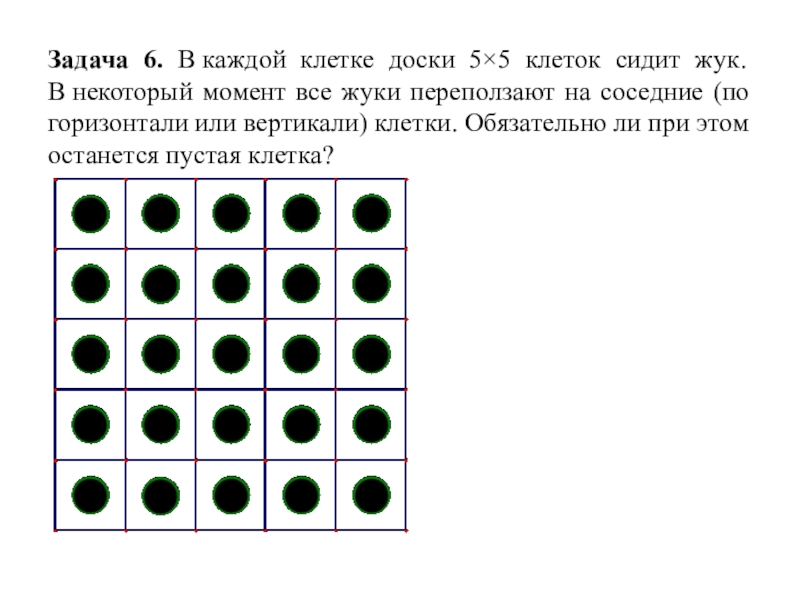 Слайд 11Задача 6. В каждой клетке доски 5×5 клеток сидит жук. В некоторый момент