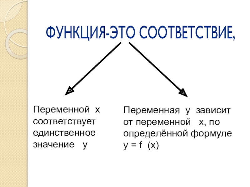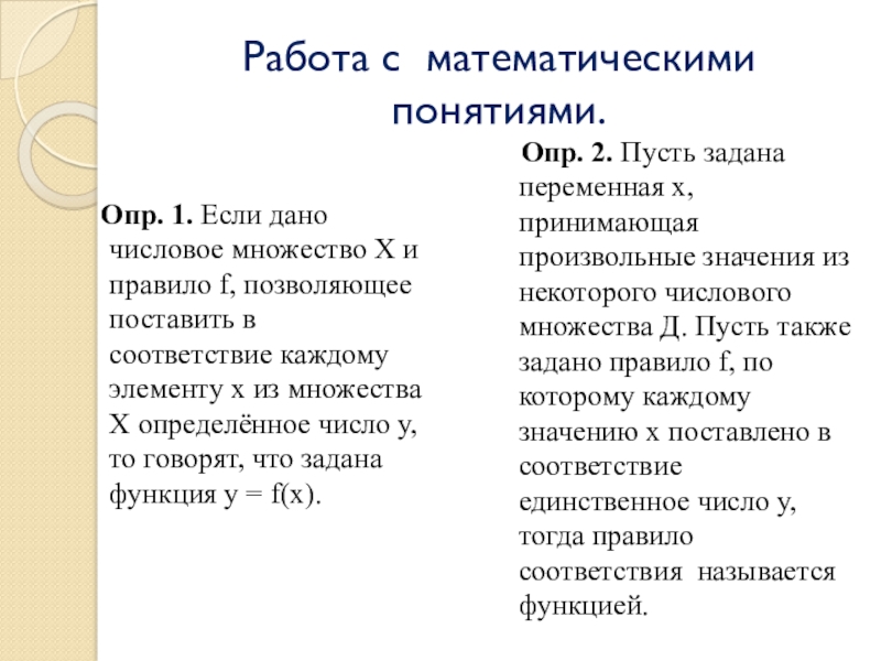 Опр. 2. Пусть задана переменная х, принимающая произвольные значения из некоторого числового множества Д. Пусть также задано правило f, по которому каждому значению х поставлено в соответствие единственное число у, тогда правило соответствия называется функцией.