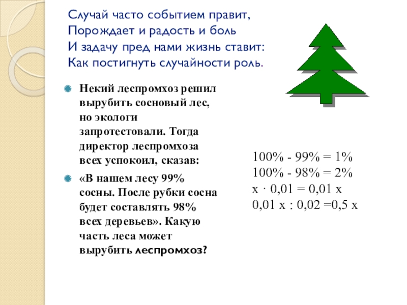«В нашем лесу 99% сосны. После рубки сосна будет составлять 98% всех деревьев». Какую часть леса может вырубить леспромхоз?