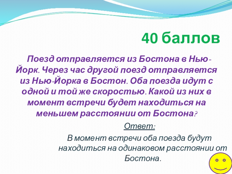 В момент встречи оба поезда будут находиться на одинаковом расстоянии от Бостона.