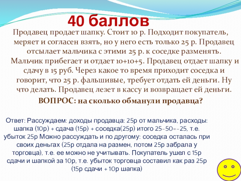 Ответ: Рассуждаем: доходы продавца: 25р от мальчика, расходы: шапка (10р) + сдача (15р) + соседка(25р) итого 25-50=-25, т.е. убыток 25р Можно рассуждать и по другому: соседка осталась при своих деньгах (25р отдала на размен, потом 25р забрала у торговца), т.е. ее можно не учитывать. Покупатель ушел с 15р сдачи и шапкой за 10р, т.е. убыток торговца составил как раз 25р (15р сдачи + 10р шапка)
