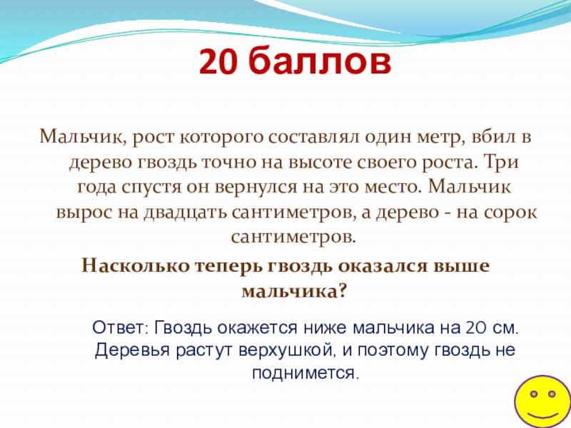 Ответ: Гвоздь окажется ниже мальчика на 20 см. Деревья растут верхушкой, и поэтому гвоздь не поднимется.