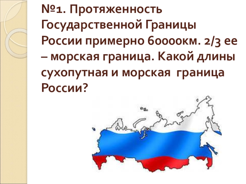 №1. Протяженность Государственной Границы России примерно 60000км. 2/3 ее – морская граница. Какой длины сухопутная и морская