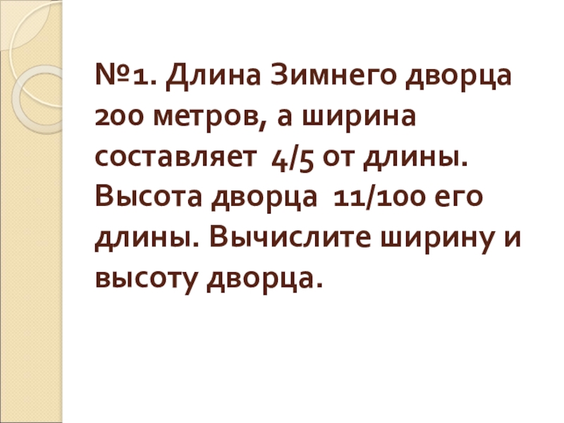 Слайд 10№1. Длина Зимнего дворца 200 метров, а ширина составляет 4/5 от