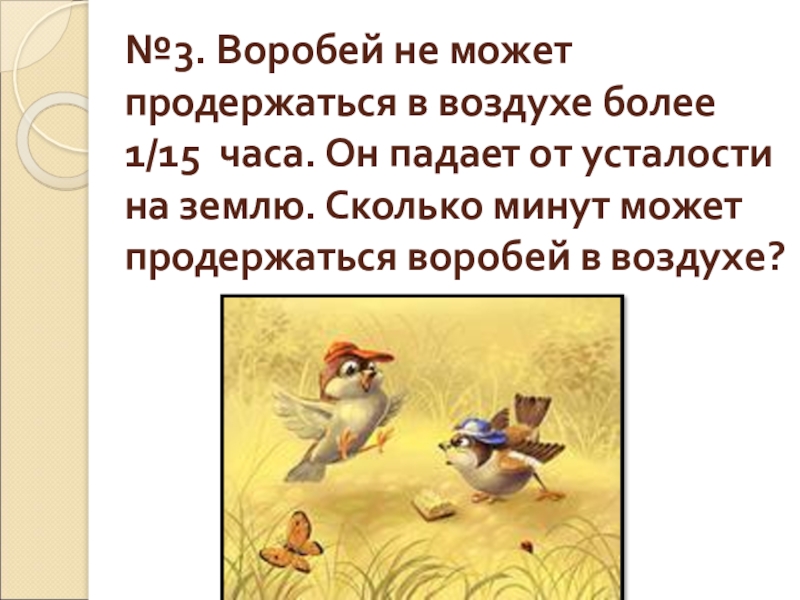 Слайд 6№3. Воробей не может продержаться в воздухе более 1/15 часа. Он