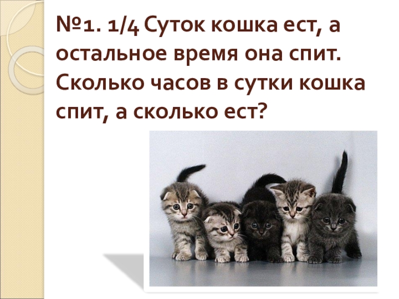 Слайд 4№1. 1/4 Суток кошка ест, а остальное время она спит. Сколько