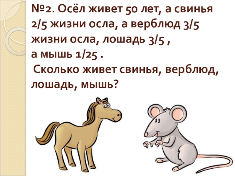 №2. Осёл живет 50 лет, а свинья 2/5 жизни осла, а верблюд 3/5 жизни осла, лошадь 3/5