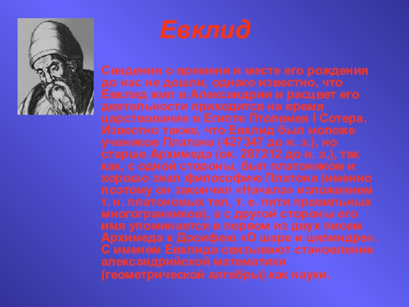 однако известно, что Евклид жил в Александрии и расцвет его деятельности приходится на время царствования в Египте Птолемея I Сотера. Известно также, что Евклид был моложе учеников Платона (427347 до н. э.), но старше Архимеда (ок. 287212 до н. э.), так как, с одной стороны, был платоником и хорошо знал философию Платона (именно поэтому он закончил «Начала» изложением т. н. платоновых тел, т. е. пяти правильных многогранников), а с другой стороны его имя упоминается в первом из двух писем Архимеда к Досифею «О шаре и цилиндре». С именем Евклида связывают становление александрийской математики (геометрической алгебры) как науки.