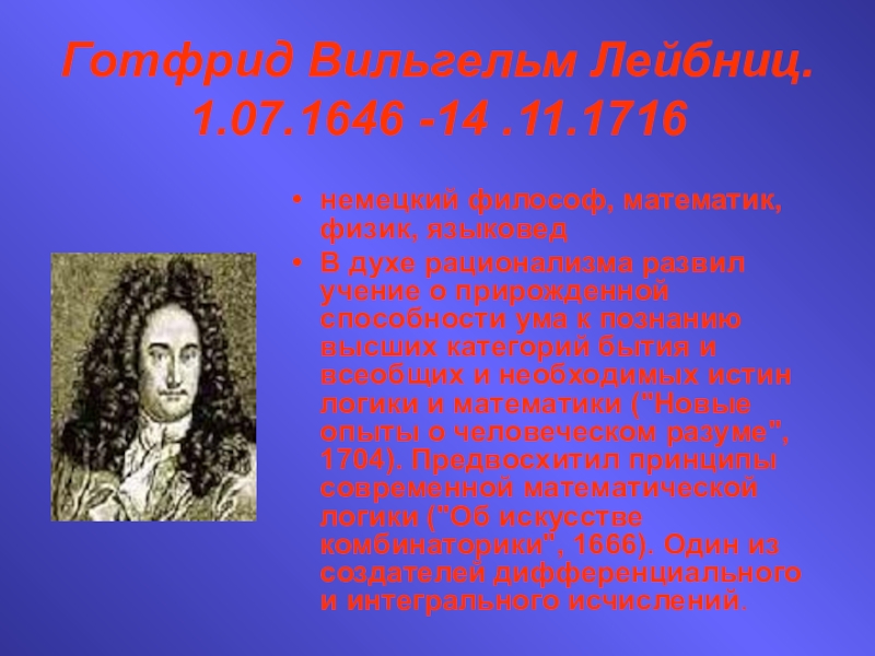 Готфрид Вильгельм Лейбниц. 1.07.1646 -14 .11.1716немецкий философ, математик, физик, языковед В духе рационализма развил учение о прирожденной