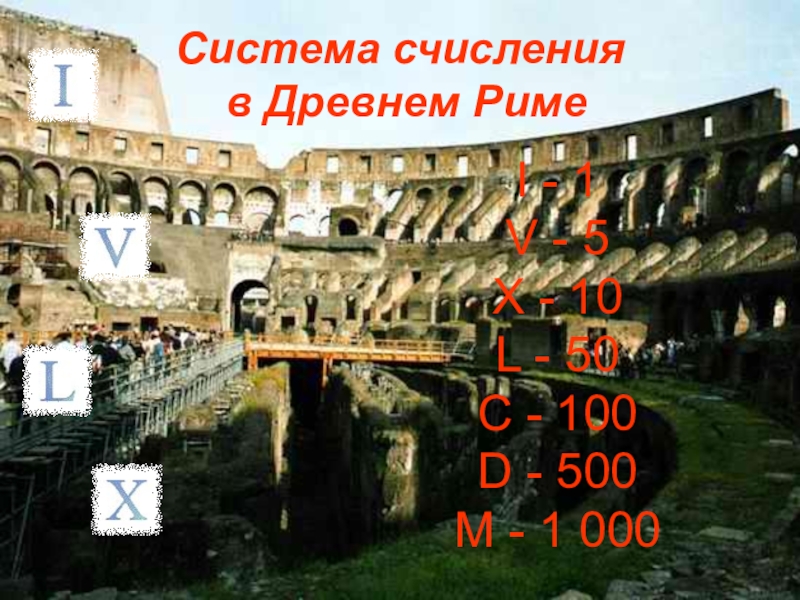Система счисления  в Древнем РимеI - 1 V - 5 X - 10 L - 50