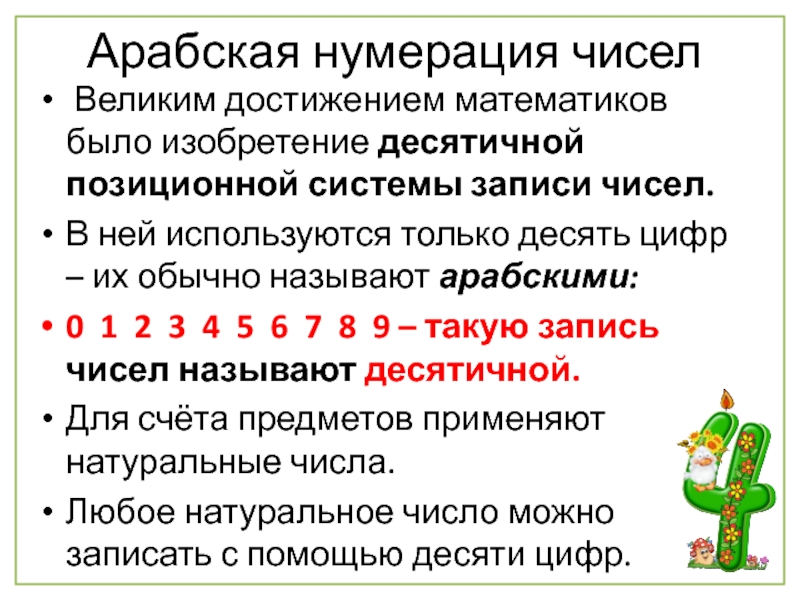 Арабская нумерация чисел Великим достижением математиков было изобретение десятичной позиционной системы записи чисел.В ней используются только десять