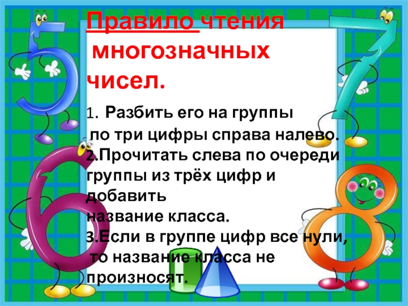справа налево. 2.Прочитать слева по очереди группы из трёх цифр и добавить название класса. 3.Если в группе цифр все нули, то название класса не произносят.