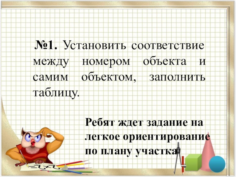 Слайд 8 №1. Установить соответствие между номером объекта и самим объектом, заполнить
