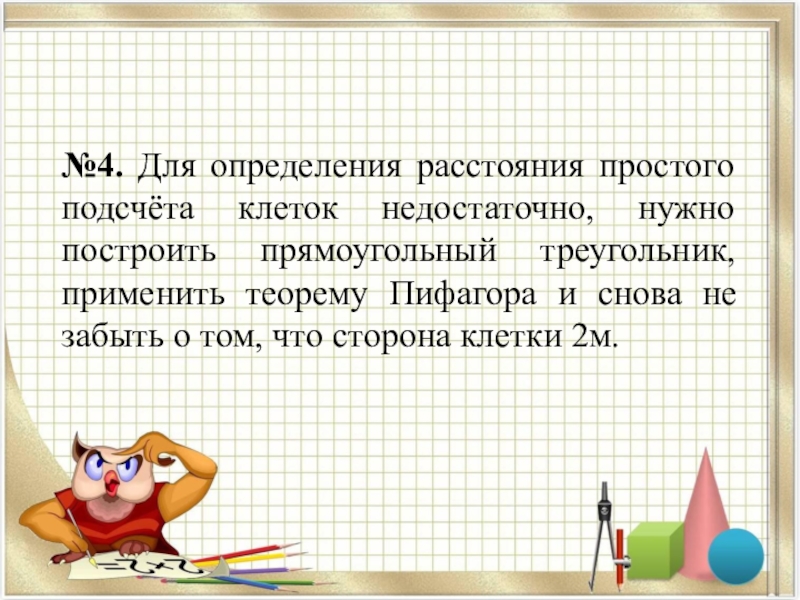 Слайд 14№4. Для определения расстояния простого подсчёта клеток недостаточно, нужно построить прямоугольный