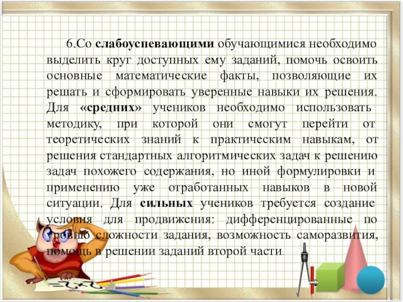 Слайд 396.Со слабоуспевающими обучающимися необходимо выделить круг доступных ему заданий, помочь освоить