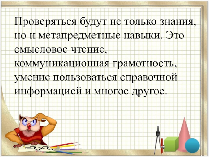 Слайд 3Проверяться будут не только знания, но и метапредметные навыки. Это смысловое