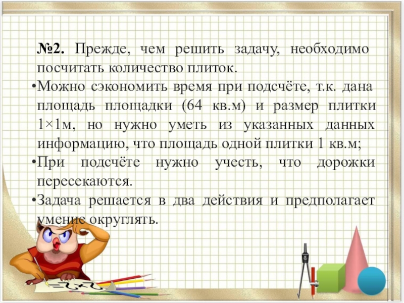 Слайд 10№2. Прежде, чем решить задачу, необходимо посчитать количество плиток.