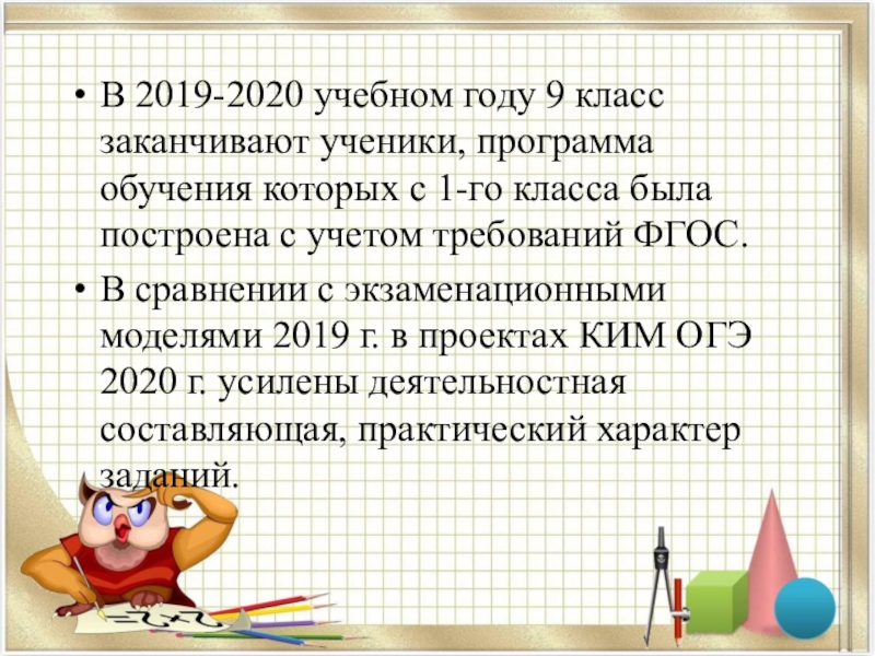 В сравнении с экзаменационными моделями 2019 г. в проектах КИМ ОГЭ 2020 г. усилены деятельностная составляющая, практический характер заданий.