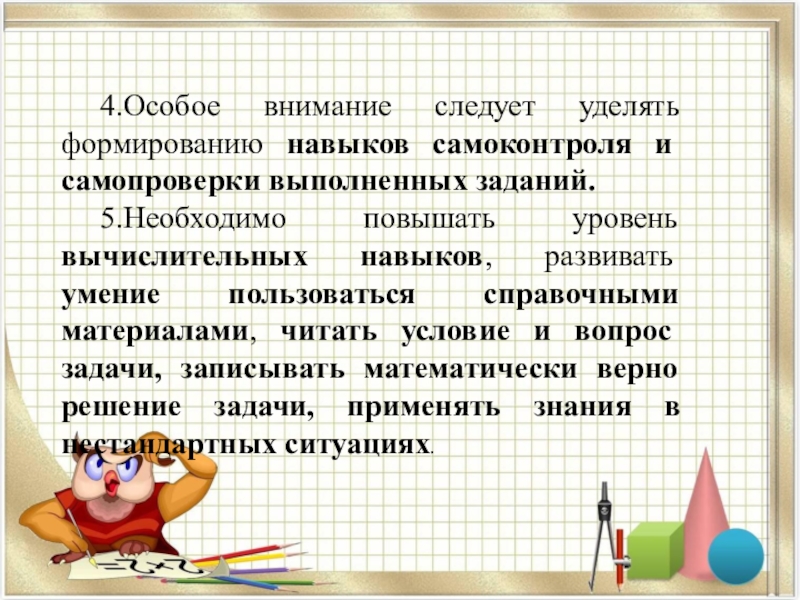 Слайд 384.Особое внимание следует уделять формированию навыков самоконтроля и самопроверки выполненных заданий.