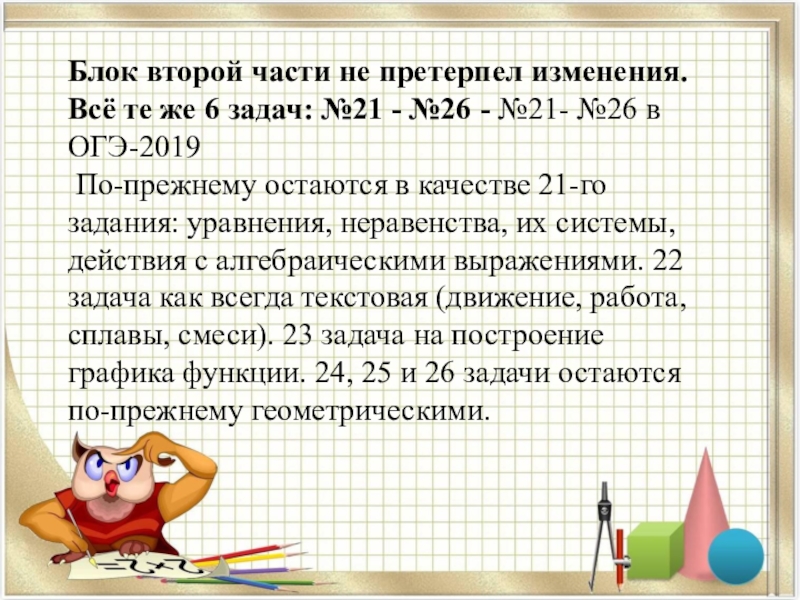 По-прежнему остаются в качестве 21-го задания: уравнения, неравенства, их системы, действия с алгебраическими выражениями. 22 задача как всегда текстовая (движение, работа, сплавы, смеси). 23 задача на построение графика функции. 24, 25 и 26 задачи остаются по-прежнему геометрическими.