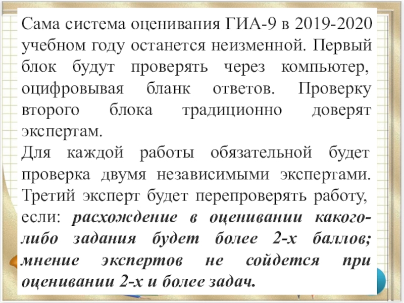 Слайд 19Сама система оценивания ГИА-9 в 2019-2020 учебном году останется неизменной. Первый