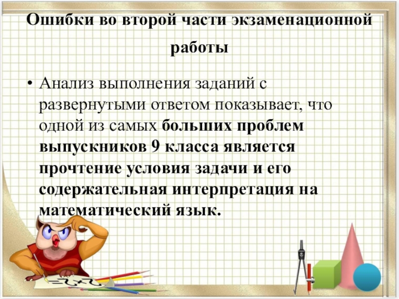 ответом показывает, что одной из самых больших проблем выпускников 9 класса является прочтение условия задачи и его содержательная интерпретация на математический язык.