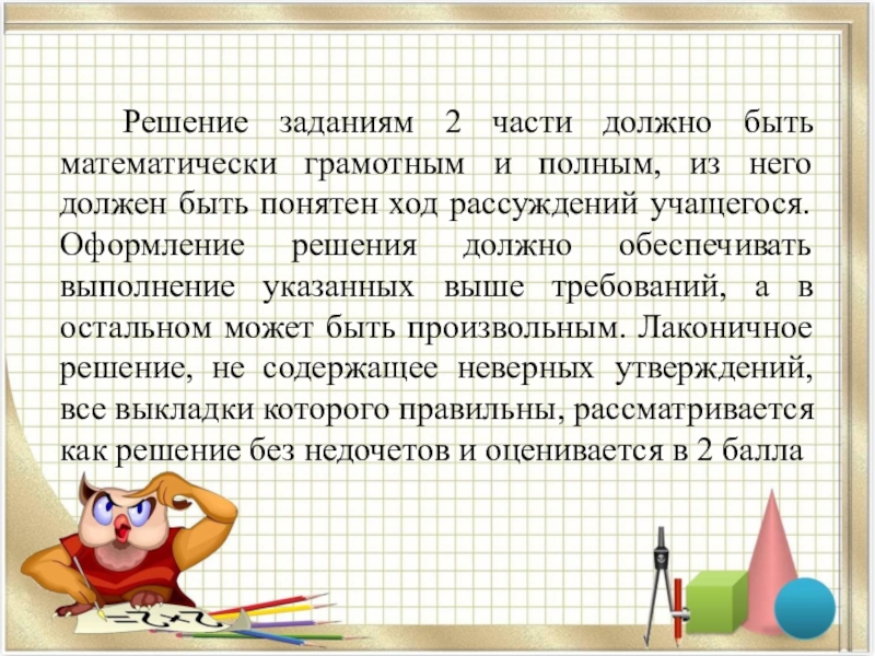 Слайд 20 Решение заданиям 2 части должно быть математически грамотным и полным,