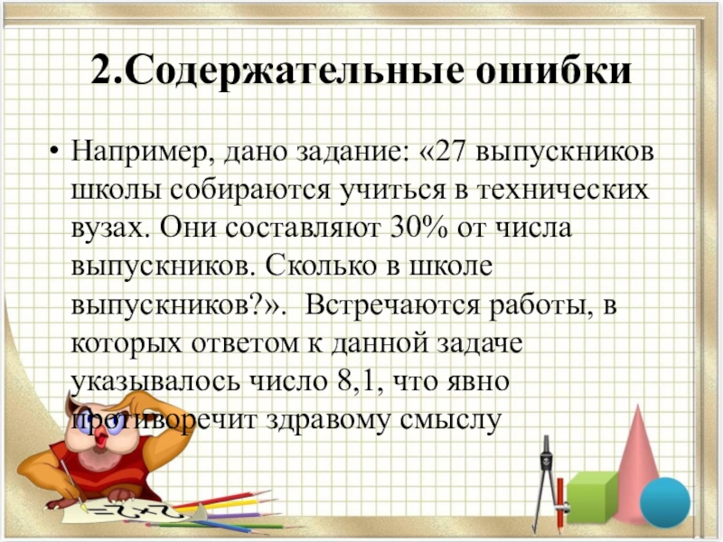 вузах. Они составляют 30% от числа выпускников. Сколько в школе выпускников?». Встречаются работы, в которых ответом к данной задаче указывалось число 8,1, что явно противоречит здравому смыслу