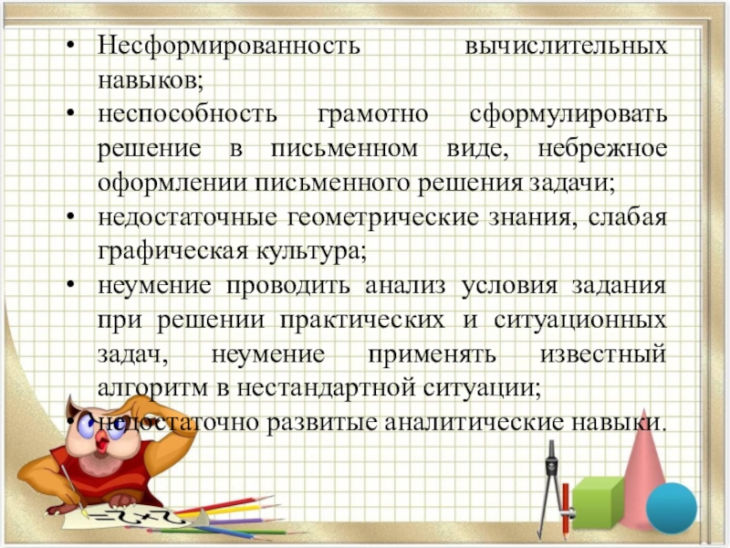Слайд 35Несформированность вычислительных навыков;