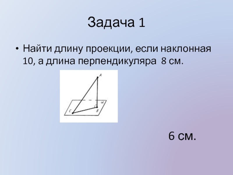 Задача 1Найти длину проекции, если наклонная 10, а длина перпендикуляра 8 см.