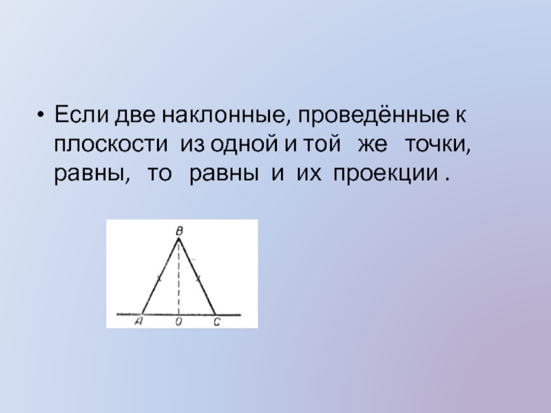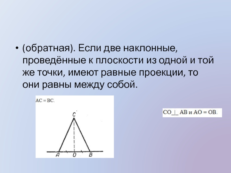 (обратная). Если две наклонные, проведённые к плоскости из одной и той же точки, имеют равные проекции, то