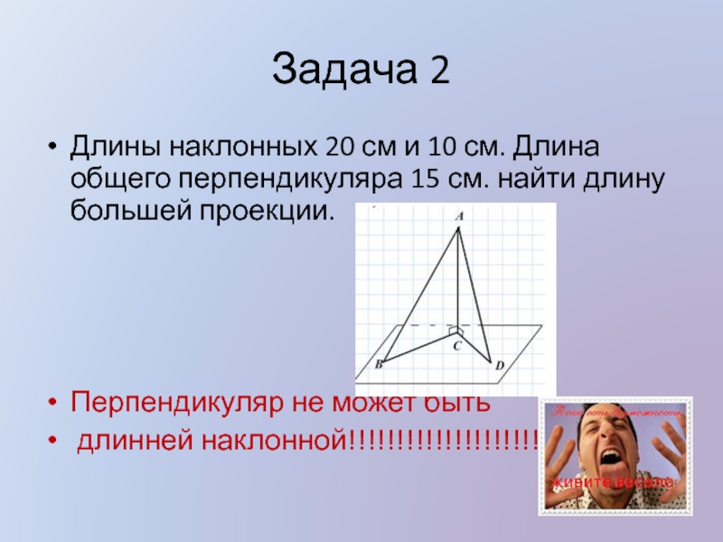 Задача 2Длины наклонных 20 см и 10 см. Длина общего перпендикуляра 15 см. найти длину большей проекции.Перпендикуляр