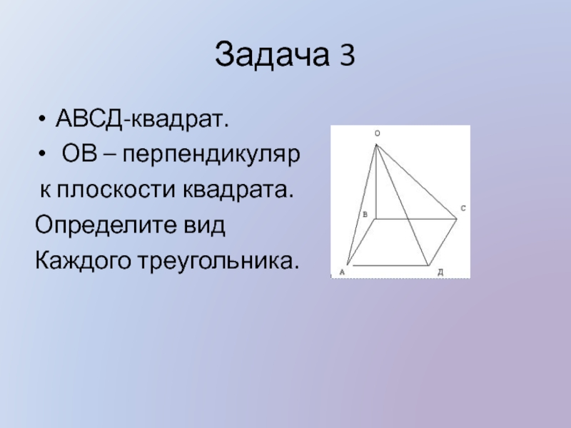 Задача 3АВСД-квадрат. ОВ – перпендикуляр к плоскости квадрата.Определите вид Каждого треугольника.