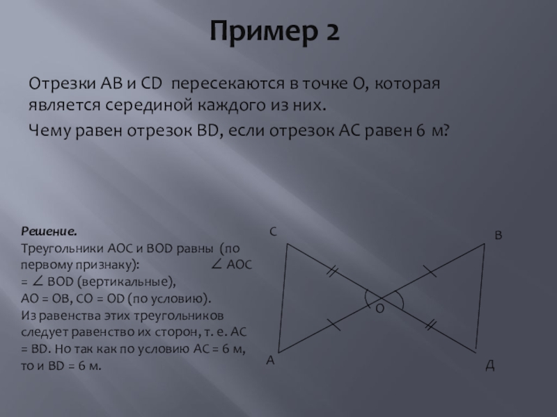 Треугольники АОС и BOD равны (по первому признаку): ∠ АОС = ∠ BOD (вертикальные),